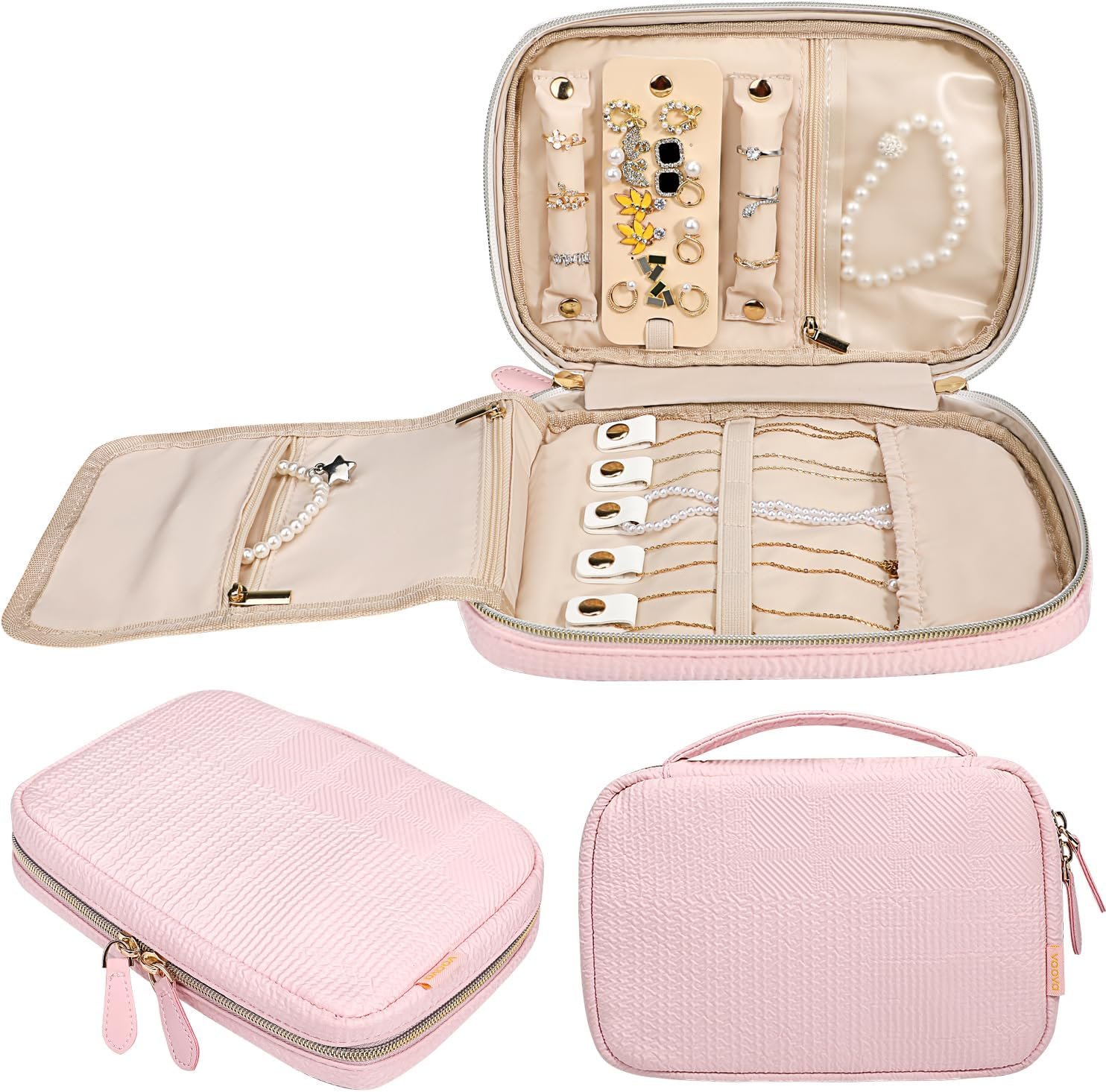 Voova Travel Jewelry Holder Organizer Case, Large Traveling Jewelry Storage Book Bag for Women Girls, Portable Jewellery Roll Pouch Folio for Necklaces, Rings, Earrings, Bracelets, Watch, Light Pink