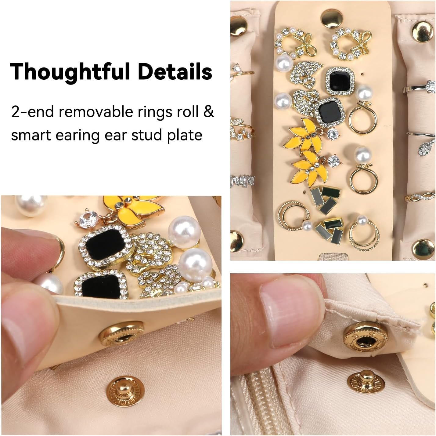 Well Organized: This large jewelry folio bag offer adequate area for your fine jewelry, include 2 ring sticks (detachable) to store rings easily,1 earring plate, 1 PVC visual pocket, 2 safe zipper pockets for privacy Items, bracelets, cuffs, watches and other souvenirs.You can visually see all of your travel essentials, makes selection easier,while being space savvy!