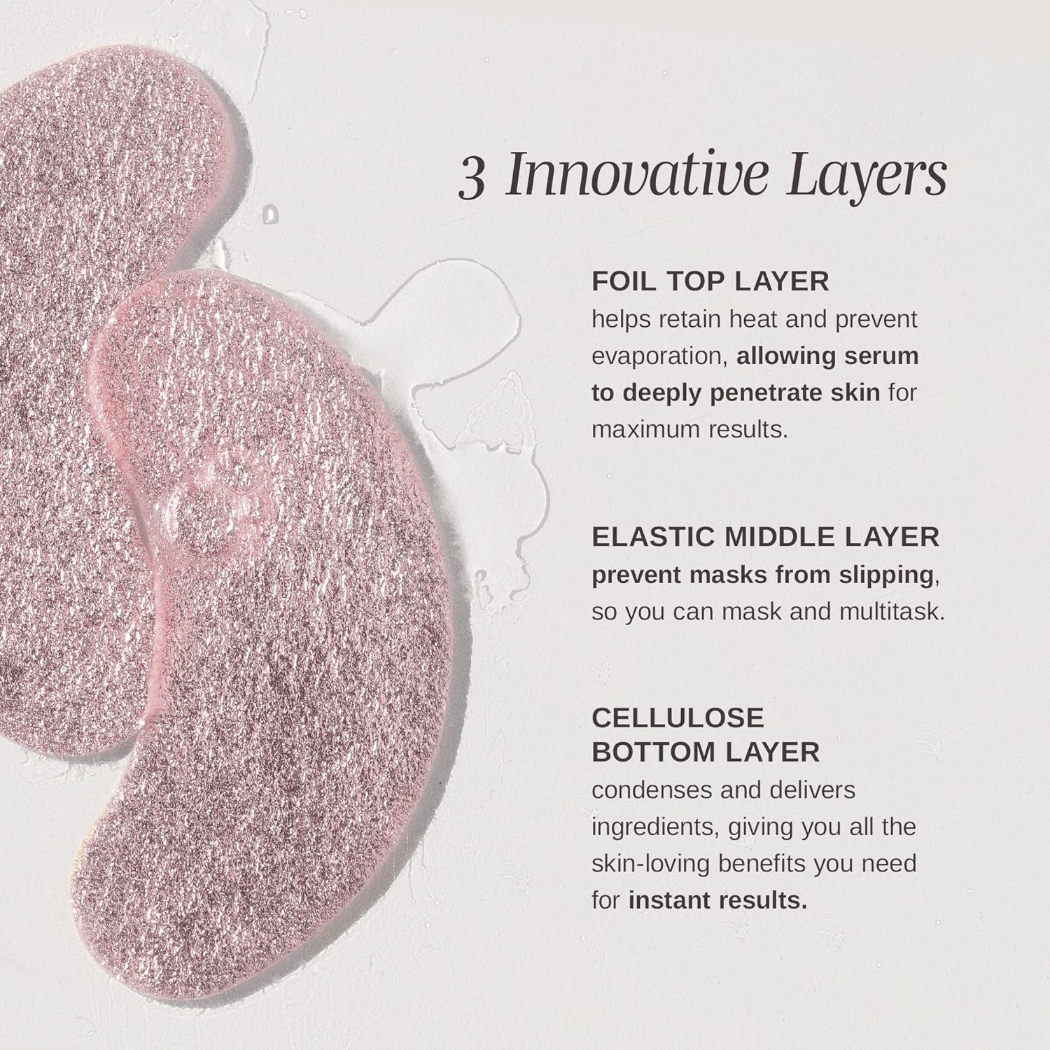 Multi-Layer Absorption Technology – The top layer of foil helps prevent evaporation, allowing the serum to deeply penetrate the skin. Its elastic middle layer prevents the eye mask patches from slipping, while the bottom layer of cellulose fiber delivers key ingredients to the delicate under eye area to deliver maximum skin-loving benefits and a smooth skin texture.